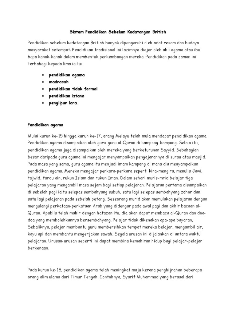 Justeru itu, mubaligh kristian telah mengambil peluang mendirikan sekolah mereka yang memakai nama methodist, katolik. Bagaimana pendidikan formal sebelum kedatangan british. Sistem pendidikan sebelum kedatangan british. The british wanted only timber, so the forests that produced timber were made to be classified to be reserved forests where people aren't given permission to move freely and practice. Sistem pendidikan tradisional(sebelum memberi kami kemudahan dan kesenangan dalam mencari dan menyelami tajuk sistem pendidikan tradisional sebelum kedatangan british.