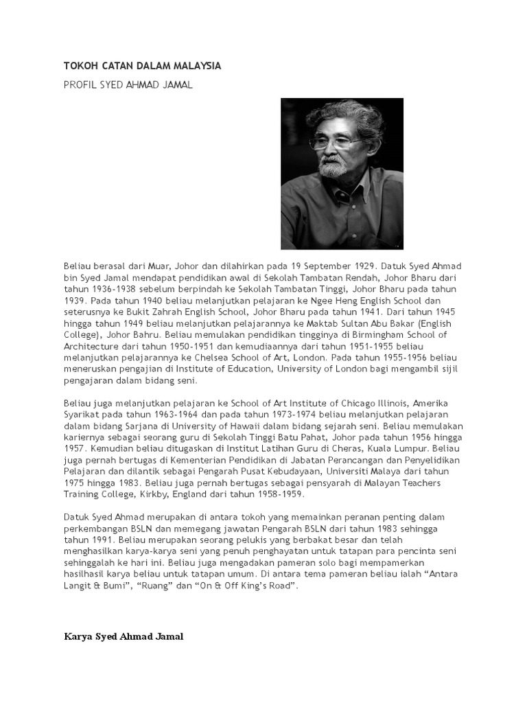 Komponen alat yang digunakan dalam catan : Tokoh seni islam di malaysia odel tokoh tokoh catan Pada masa itu, pelukis malaysia bebas daripada sebarang kongkongan kerana belum terdedah kepada tradisi atau aliran agung dari barat. Pembaharuan stail dan ideologi seni lukis negara. Syed ahmad jamal dilahirkan pada 19 september 1929 di bandar maharani johor.